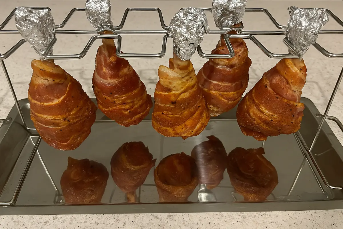 Cosce di pollo lollipop avvolte nel bacon e cotte lentamente per ottenere una carne succosa, una crosticina irresistibile e un profumo da vero barbecue americano.