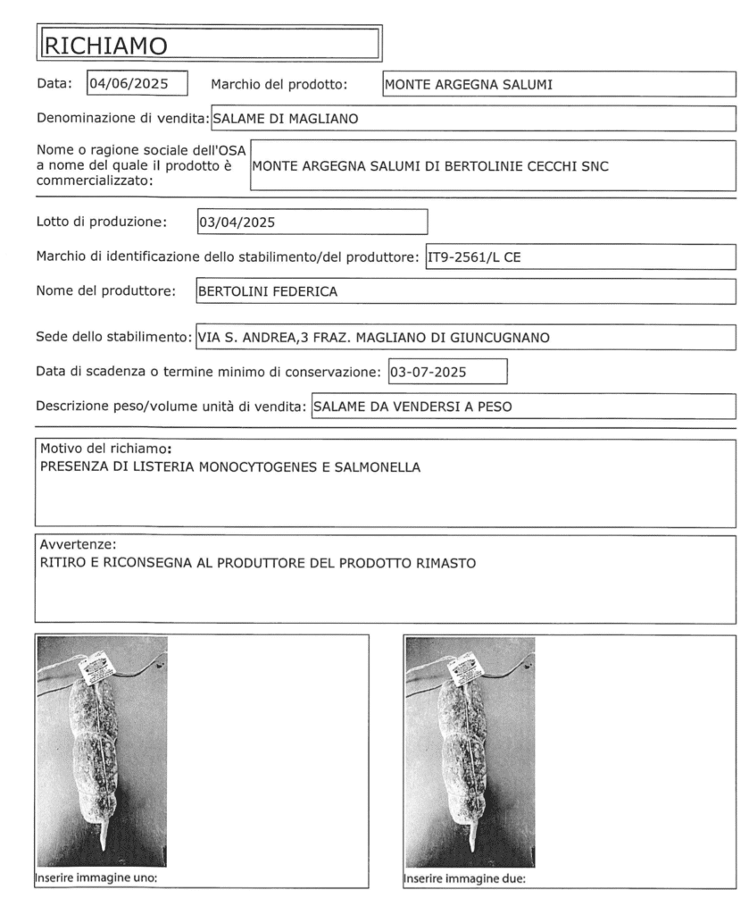 Entrando nello specifico, possiamo vedere nel comunicato diffuso dal Ministero della Salute che il prodotto coinvolto, salame di Magliano a marchio Monte Argegna Salumi, è relativo al lotto di produzione 3 aprile 2025, la data di scadenza riportata è il 3 luglio 2025 e viene venduto come salame da vendersi a peso.